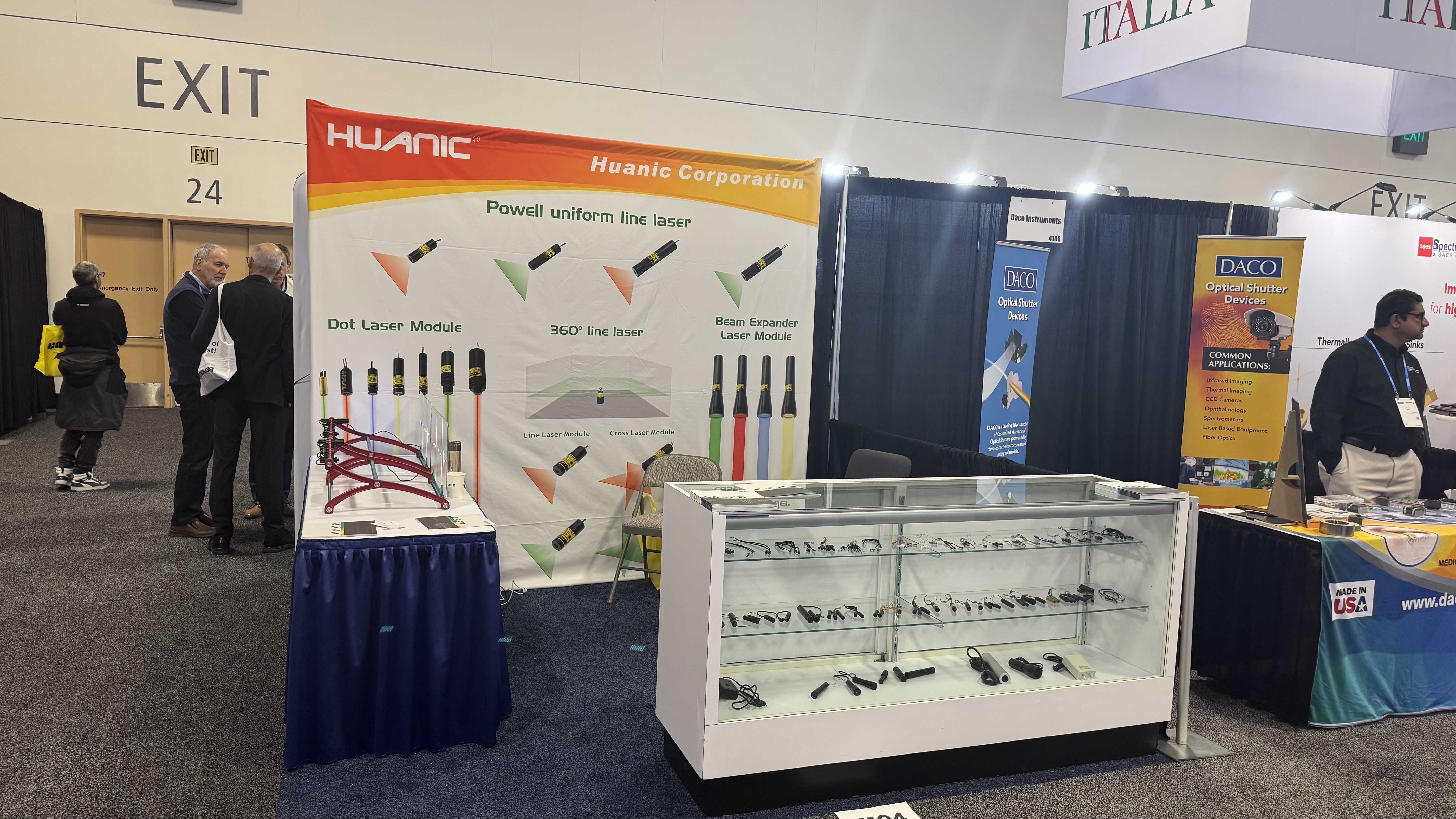 华科光电参展产品有405nm、450nm、520nm、532nm、635nm、650nm、670nm、780nm、808nm、830nm、850nm、940nm、980nm、鲍威尔均匀线激光器半导体激光器及LED指示光源产品,其中半导体激光器产品从光斑种类可分为点状光斑、一字线状光斑(含360°一字线)、十字线状光斑产品,LED指示光源产品有红光、绿光及黄光产品。